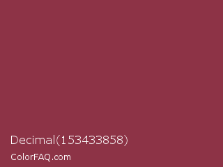 Decimal 153433858 Color is a normal red color and the nearest color is Solid Pink #893843. Hex code #8d3346 and RGB value is rgb(141,51,70). In RGB color space, this color is composed of 55% red, 20% green, 27% blue, In CMYK color space, this color is composed of 0% cyan, 64% magenta, 50% yellow , 45% black , In HSL color space, this color has a hue angle of 347° , 47% saturation and 38% lightness.