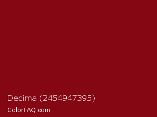 Decimal 2454947395 Color is a dark red color and the nearest color is Red Devil #860111. Hex code #840713 and RGB value is rgb(132,7,19). In RGB color space, this color is composed of 52% red, 3% green, 7% blue, In CMYK color space, this color is composed of 0% cyan, 95% magenta, 86% yellow , 48% black , In HSL color space, this color has a hue angle of 354° , 90% saturation and 27% lightness.
