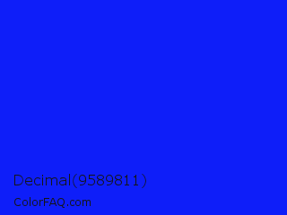 Decimal 9589811 Color is a normal blue color and the nearest color is Bluebonnet #1c1cf0. Hex code #0e1ef9 and RGB value is rgb(14,30,249). In RGB color space, this color is composed of 5% red, 12% green, 98% blue, In CMYK color space, this color is composed of 94% cyan, 88% magenta, 0% yellow , 2% black , In HSL color space, this color has a hue angle of 236° , 95% saturation and 52% lightness.