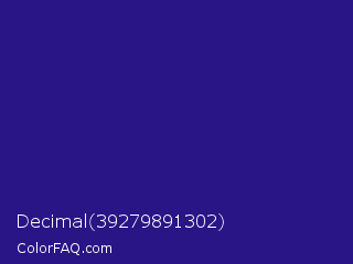 Decimal 39279891302 Color is a dark indigo color and the nearest color is Blue Gem #2c0e8c. Hex code #291586 and RGB value is rgb(41,21,134). In RGB color space, this color is composed of 16% red, 8% green, 53% blue, In CMYK color space, this color is composed of 69% cyan, 84% magenta, 0% yellow , 47% black , In HSL color space, this color has a hue angle of 251° , 73% saturation and 30% lightness.