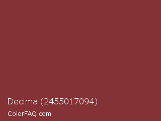 Decimal 2455017094 Color is a normal red color and the nearest color is Lotus #863c3c. Hex code #843236 and RGB value is rgb(132,50,54). In RGB color space, this color is composed of 52% red, 20% green, 21% blue, In CMYK color space, this color is composed of 0% cyan, 62% magenta, 59% yellow , 48% black , In HSL color space, this color has a hue angle of 357° , 45% saturation and 36% lightness.