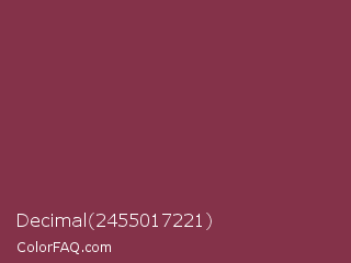 Decimal 2455017221 Color is a normal rose color and the nearest color is Solid Pink #893843. Hex code #843249 and RGB value is rgb(132,50,73). In RGB color space, this color is composed of 52% red, 20% green, 29% blue, In CMYK color space, this color is composed of 0% cyan, 62% magenta, 45% yellow , 48% black , In HSL color space, this color has a hue angle of 343° , 45% saturation and 36% lightness.