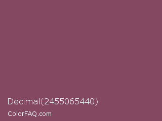 Decimal 2455065440 Color is a normal rose color and the nearest color is Cannon Pink #894367. Hex code #844860 and RGB value is rgb(132,72,96). In RGB color space, this color is composed of 52% red, 28% green, 38% blue, In CMYK color space, this color is composed of 0% cyan, 45% magenta, 27% yellow , 48% black , In HSL color space, this color has a hue angle of 336° , 29% saturation and 40% lightness.