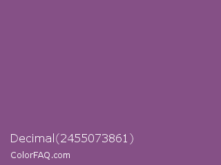 Decimal 2455073861 Color is a normal magenta color and the nearest color is Razzmic Berry #8d4e85. Hex code #845085 and RGB value is rgb(132,80,133). In RGB color space, this color is composed of 52% red, 31% green, 52% blue, In CMYK color space, this color is composed of 1% cyan, 40% magenta, 0% yellow , 48% black , In HSL color space, this color has a hue angle of 299° , 25% saturation and 42% lightness.