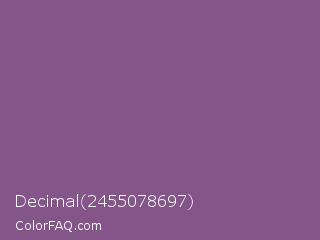 Decimal 2455078697 Color is a normal magenta color and the nearest color is Chinese Violet #856088. Hex code #845589 and RGB value is rgb(132,85,137). In RGB color space, this color is composed of 52% red, 33% green, 54% blue, In CMYK color space, this color is composed of 4% cyan, 38% magenta, 0% yellow , 46% black , In HSL color space, this color has a hue angle of 294° , 23% saturation and 44% lightness.