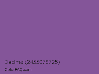 Decimal 2455078725 Color is a normal purple color and the nearest color is French Lilac #86608e. Hex code #845599 and RGB value is rgb(132,85,153). In RGB color space, this color is composed of 52% red, 33% green, 60% blue, In CMYK color space, this color is composed of 14% cyan, 44% magenta, 0% yellow , 40% black , In HSL color space, this color has a hue angle of 281° , 29% saturation and 47% lightness.