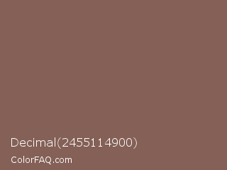 Decimal 2455114900 Color is a normal red color and the nearest color is Pastel Brown #836953. Hex code #846056 and RGB value is rgb(132,96,86). In RGB color space, this color is composed of 52% red, 38% green, 34% blue, In CMYK color space, this color is composed of 0% cyan, 27% magenta, 35% yellow , 48% black , In HSL color space, this color has a hue angle of 13° , 21% saturation and 43% lightness.