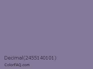 Decimal 2455140101 Color is a normal violet color and the nearest color is Waterloo #7b7c94. Hex code #847899 and RGB value is rgb(132,120,153). In RGB color space, this color is composed of 52% red, 47% green, 60% blue, In CMYK color space, this color is composed of 14% cyan, 22% magenta, 0% yellow , 40% black , In HSL color space, this color has a hue angle of 262° , 14% saturation and 54% lightness.