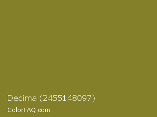 Decimal 2455148097 Color is a normal yellow color and the nearest color is Old Moss Green #867e36. Hex code #848029 and RGB value is rgb(132,128,41). In RGB color space, this color is composed of 52% red, 50% green, 16% blue, In CMYK color space, this color is composed of 0% cyan, 3% magenta, 69% yellow , 48% black , In HSL color space, this color has a hue angle of 57° , 53% saturation and 34% lightness.