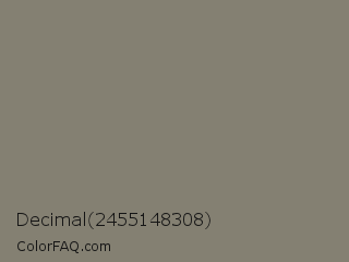 Decimal 2455148308 Color is a normal yellow color and the nearest color is Bandicoot #858470. Hex code #848072 and RGB value is rgb(132,128,114). In RGB color space, this color is composed of 52% red, 50% green, 45% blue, In CMYK color space, this color is composed of 0% cyan, 3% magenta, 14% yellow , 48% black , In HSL color space, this color has a hue angle of 47° , 7% saturation and 48% lightness.