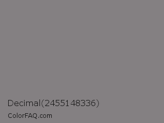 Decimal 2455148336 Color is a normal rose color and the nearest color is Battleship Grey #848482. Hex code #848082 and RGB value is rgb(132,128,130). In RGB color space, this color is composed of 52% red, 50% green, 51% blue, In CMYK color space, this color is composed of 0% cyan, 3% magenta, 2% yellow , 48% black , In HSL color space, this color has a hue angle of 330° , 2% saturation and 51% lightness.