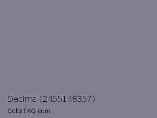 Decimal 2455148357 Color is a normal indigo color and the nearest color is Mamba #8e8190. Hex code #848091 and RGB value is rgb(132,128,145). In RGB color space, this color is composed of 52% red, 50% green, 57% blue, In CMYK color space, this color is composed of 9% cyan, 12% magenta, 0% yellow , 43% black , In HSL color space, this color has a hue angle of 254° , 7% saturation and 54% lightness.
