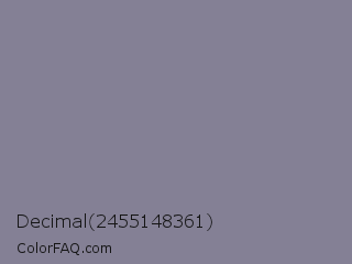 Decimal 2455148361 Color is a normal indigo color and the nearest color is Roman Silver #838996. Hex code #848095 and RGB value is rgb(132,128,149). In RGB color space, this color is composed of 52% red, 50% green, 58% blue, In CMYK color space, this color is composed of 11% cyan, 14% magenta, 0% yellow , 42% black , In HSL color space, this color has a hue angle of 251° , 9% saturation and 54% lightness.