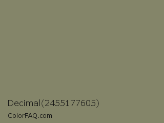 Decimal 2455177605 Color is a normal yellow color and the nearest color is Bandicoot #858470. Hex code #848569 and RGB value is rgb(132,133,105). In RGB color space, this color is composed of 52% red, 52% green, 41% blue, In CMYK color space, this color is composed of 1% cyan, 0% magenta, 21% yellow , 48% black , In HSL color space, this color has a hue angle of 62° , 12% saturation and 47% lightness.