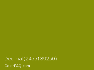 Decimal 2455189250 Color is a dark yellow color and the nearest color is Olive #808000. Hex code #849006 and RGB value is rgb(132,144,6). In RGB color space, this color is composed of 52% red, 56% green, 2% blue, In CMYK color space, this color is composed of 8% cyan, 0% magenta, 96% yellow , 44% black , In HSL color space, this color has a hue angle of 65° , 92% saturation and 29% lightness.