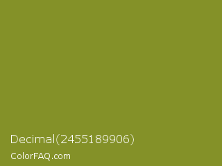 Decimal 2455189906 Color is a normal yellow color and the nearest color is Wasabi #788a25. Hex code #849128 and RGB value is rgb(132,145,40). In RGB color space, this color is composed of 52% red, 57% green, 16% blue, In CMYK color space, this color is composed of 9% cyan, 0% magenta, 72% yellow , 43% black , In HSL color space, this color has a hue angle of 67° , 57% saturation and 36% lightness.