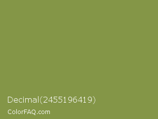 Decimal 2455196419 Color is a normal lime color and the nearest color is Sycamore #908d39. Hex code #849647 and RGB value is rgb(132,150,71). In RGB color space, this color is composed of 52% red, 59% green, 28% blue, In CMYK color space, this color is composed of 12% cyan, 0% magenta, 53% yellow , 41% black , In HSL color space, this color has a hue angle of 74° , 36% saturation and 43% lightness.