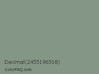 Decimal 2455196518 Color is a normal green color and the nearest color is Spanish Green #819885. Hex code #849686 and RGB value is rgb(132,150,134). In RGB color space, this color is composed of 52% red, 59% green, 53% blue, In CMYK color space, this color is composed of 12% cyan, 0% magenta, 11% yellow , 41% black , In HSL color space, this color has a hue angle of 127° , 8% saturation and 55% lightness.
