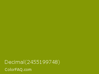 Decimal 2455199748 Color is a normal yellow color and the nearest color is Limeade #6f9d02. Hex code #849904 and RGB value is rgb(132,153,4). In RGB color space, this color is composed of 52% red, 60% green, 2% blue, In CMYK color space, this color is composed of 14% cyan, 0% magenta, 97% yellow , 40% black , In HSL color space, this color has a hue angle of 68° , 95% saturation and 31% lightness.
