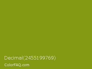 Decimal 2455199769 Color is a normal yellow color and the nearest color is Trendy Green #7c881a. Hex code #849913 and RGB value is rgb(132,153,19). In RGB color space, this color is composed of 52% red, 60% green, 7% blue, In CMYK color space, this color is composed of 14% cyan, 0% magenta, 88% yellow , 40% black , In HSL color space, this color has a hue angle of 69° , 78% saturation and 34% lightness.