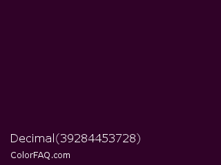 Decimal 39284453728 Color is a very dark magenta color and the nearest color is Jacaranda #2e0329. Hex code #300228 and RGB value is rgb(48,2,40). In RGB color space, this color is composed of 19% red, 1% green, 16% blue, In CMYK color space, this color is composed of 0% cyan, 96% magenta, 17% yellow , 81% black , In HSL color space, this color has a hue angle of 310° , 92% saturation and 10% lightness.
