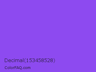 Decimal 153458528 Color is a light violet color and the nearest color is Navy Purple #9457eb. Hex code #8d4af0 and RGB value is rgb(141,74,240). In RGB color space, this color is composed of 55% red, 29% green, 94% blue, In CMYK color space, this color is composed of 41% cyan, 69% magenta, 0% yellow , 6% black , In HSL color space, this color has a hue angle of 264° , 85% saturation and 62% lightness.