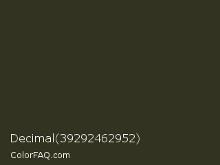 Decimal 39292462952 Color is a very dark yellow color and the nearest color is Rangitoto #2e3222. Hex code #323320 and RGB value is rgb(50,51,32). In RGB color space, this color is composed of 20% red, 20% green, 13% blue, In CMYK color space, this color is composed of 2% cyan, 0% magenta, 37% yellow , 80% black , In HSL color space, this color has a hue angle of 63° , 23% saturation and 16% lightness.