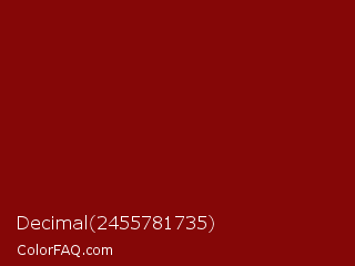 Decimal 2455781735 Color is a dark red color and the nearest color is Deep Red #850101. Hex code #850707 and RGB value is rgb(133,7,7). In RGB color space, this color is composed of 52% red, 3% green, 3% blue, In CMYK color space, this color is composed of 0% cyan, 95% magenta, 95% yellow , 48% black , In HSL color space, this color has a hue angle of 0° , 90% saturation and 27% lightness.