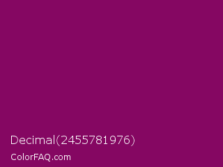 Decimal 2455781976 Color is a dark magenta color and the nearest color is Cardinal Pink #8c055e. Hex code #850762 and RGB value is rgb(133,7,98). In RGB color space, this color is composed of 52% red, 3% green, 38% blue, In CMYK color space, this color is composed of 0% cyan, 95% magenta, 26% yellow , 48% black , In HSL color space, this color has a hue angle of 317° , 90% saturation and 27% lightness.
