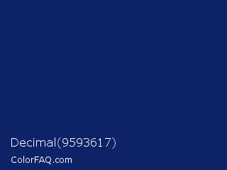 Decimal 9593617 Color is a dark blue color and the nearest color is Deep Sapphire #082567. Hex code #0e2267 and RGB value is rgb(14,34,103). In RGB color space, this color is composed of 5% red, 13% green, 40% blue, In CMYK color space, this color is composed of 86% cyan, 67% magenta, 0% yellow , 60% black , In HSL color space, this color has a hue angle of 227° , 76% saturation and 23% lightness.