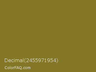 Decimal 2455971954 Color is a normal yellow color and the nearest color is Spanish Bistre #807532. Hex code #857728 and RGB value is rgb(133,119,40). In RGB color space, this color is composed of 52% red, 47% green, 16% blue, In CMYK color space, this color is composed of 0% cyan, 11% magenta, 70% yellow , 48% black , In HSL color space, this color has a hue angle of 51° , 54% saturation and 34% lightness.