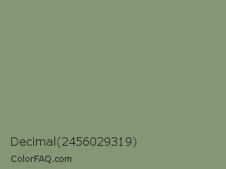 Decimal 2456029319 Color is a normal green color and the nearest color is Battleship Gray #828f72. Hex code #859677 and RGB value is rgb(133,150,119). In RGB color space, this color is composed of 52% red, 59% green, 47% blue, In CMYK color space, this color is composed of 11% cyan, 0% magenta, 21% yellow , 41% black , In HSL color space, this color has a hue angle of 93° , 13% saturation and 53% lightness.