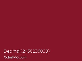Decimal 2456236833 Color is a dark red color and the nearest color is Antique Ruby #841b2d. Hex code #861529 and RGB value is rgb(134,21,41). In RGB color space, this color is composed of 53% red, 8% green, 16% blue, In CMYK color space, this color is composed of 0% cyan, 84% magenta, 69% yellow , 47% black , In HSL color space, this color has a hue angle of 349° , 73% saturation and 30% lightness.