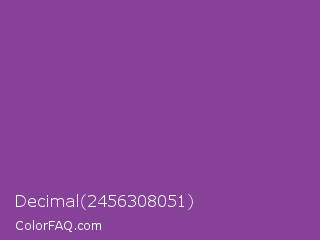 Decimal 2456308051 Color is a normal purple color and the nearest color is Vivid Violet #803790. Hex code #864299 and RGB value is rgb(134,66,153). In RGB color space, this color is composed of 53% red, 26% green, 60% blue, In CMYK color space, this color is composed of 12% cyan, 57% magenta, 0% yellow , 40% black , In HSL color space, this color has a hue angle of 287° , 40% saturation and 43% lightness.