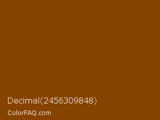 Decimal 2456309848 Color is a dark orange color and the nearest color is Peru Tan #7f3a02. Hex code #864302 and RGB value is rgb(134,67,2). In RGB color space, this color is composed of 53% red, 26% green, 1% blue, In CMYK color space, this color is composed of 0% cyan, 50% magenta, 99% yellow , 47% black , In HSL color space, this color has a hue angle of 30° , 97% saturation and 27% lightness.