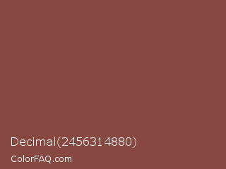 Decimal 2456314880 Color is a normal red color and the nearest color is Ironstone #86483c. Hex code #864840 and RGB value is rgb(134,72,64). In RGB color space, this color is composed of 53% red, 28% green, 25% blue, In CMYK color space, this color is composed of 0% cyan, 46% magenta, 52% yellow , 47% black , In HSL color space, this color has a hue angle of 7° , 35% saturation and 39% lightness.