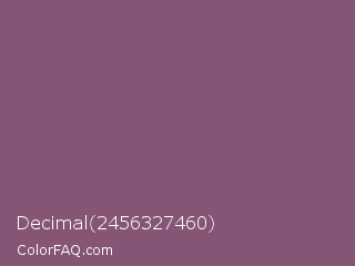 Decimal 2456327460 Color is a normal magenta color and the nearest color is Sugar Plum #914e75. Hex code #865474 and RGB value is rgb(134,84,116). In RGB color space, this color is composed of 53% red, 33% green, 45% blue, In CMYK color space, this color is composed of 0% cyan, 37% magenta, 13% yellow , 47% black , In HSL color space, this color has a hue angle of 322° , 23% saturation and 43% lightness.