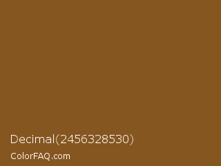 Decimal 2456328530 Color is a normal orange color and the nearest color is Grizzly #885818. Hex code #865620 and RGB value is rgb(134,86,32). In RGB color space, this color is composed of 53% red, 34% green, 13% blue, In CMYK color space, this color is composed of 0% cyan, 36% magenta, 76% yellow , 47% black , In HSL color space, this color has a hue angle of 32° , 61% saturation and 33% lightness.