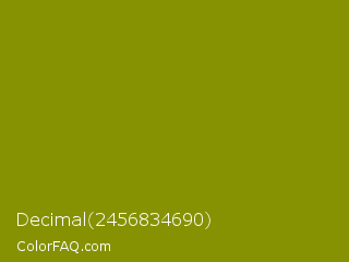 Decimal 2456834690 Color is a dark yellow color and the nearest color is Olive #808000. Hex code #869202 and RGB value is rgb(134,146,2). In RGB color space, this color is composed of 53% red, 57% green, 1% blue, In CMYK color space, this color is composed of 8% cyan, 0% magenta, 99% yellow , 43% black , In HSL color space, this color has a hue angle of 65° , 97% saturation and 29% lightness.