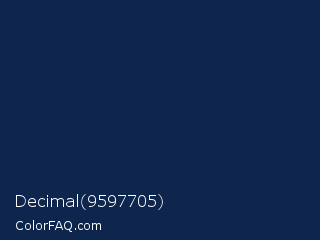 Decimal 9597705 Color is a very dark blue color and the nearest color is Blue Zodiac #13264d. Hex code #0e264d and RGB value is rgb(14,38,77). In RGB color space, this color is composed of 5% red, 15% green, 30% blue, In CMYK color space, this color is composed of 82% cyan, 51% magenta, 0% yellow , 70% black , In HSL color space, this color has a hue angle of 217° , 69% saturation and 18% lightness.