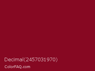 Decimal 2457031970 Color is a dark red color and the nearest color is Monarch #8b0723. Hex code #870822 and RGB value is rgb(135,8,34). In RGB color space, this color is composed of 53% red, 3% green, 13% blue, In CMYK color space, this color is composed of 0% cyan, 94% magenta, 75% yellow , 47% black , In HSL color space, this color has a hue angle of 348° , 89% saturation and 28% lightness.