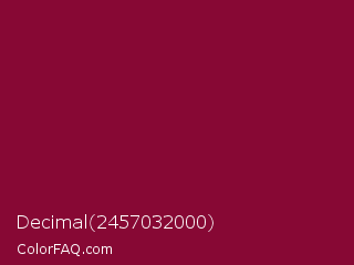 Decimal 2457032000 Color is a dark rose color and the nearest color is Siren #7a013a. Hex code #870834 and RGB value is rgb(135,8,52). In RGB color space, this color is composed of 53% red, 3% green, 20% blue, In CMYK color space, this color is composed of 0% cyan, 94% magenta, 61% yellow , 47% black , In HSL color space, this color has a hue angle of 339° , 89% saturation and 28% lightness.