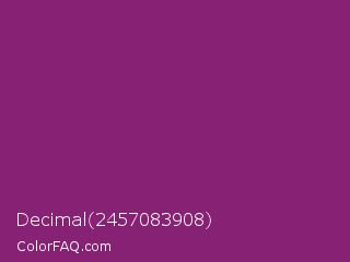 Decimal 2457083908 Color is a normal magenta color and the nearest color is Razzmic Berry Crayola #843179. Hex code #872174 and RGB value is rgb(135,33,116). In RGB color space, this color is composed of 53% red, 13% green, 45% blue, In CMYK color space, this color is composed of 0% cyan, 76% magenta, 14% yellow , 47% black , In HSL color space, this color has a hue angle of 311° , 61% saturation and 33% lightness.