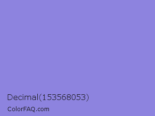 Decimal 153568053 Color is a light indigo color and the nearest color is Chetwode Blue #8581d9. Hex code #8d83df and RGB value is rgb(141,131,223). In RGB color space, this color is composed of 55% red, 51% green, 87% blue, In CMYK color space, this color is composed of 37% cyan, 41% magenta, 0% yellow , 13% black , In HSL color space, this color has a hue angle of 247° , 59% saturation and 69% lightness.