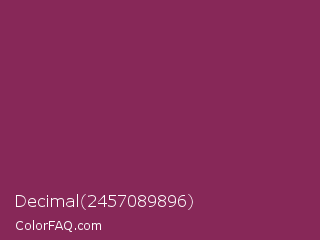 Decimal 2457089896 Color is a normal rose color and the nearest color is Dark Raspberry #872657. Hex code #872858 and RGB value is rgb(135,40,88). In RGB color space, this color is composed of 53% red, 16% green, 35% blue, In CMYK color space, this color is composed of 0% cyan, 70% magenta, 35% yellow , 47% black , In HSL color space, this color has a hue angle of 330° , 54% saturation and 34% lightness.