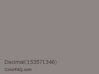 Decimal 153571346 Color is a normal red color and the nearest color is Natural Gray #8b8680. Hex code #8d8684 and RGB value is rgb(141,134,132). In RGB color space, this color is composed of 55% red, 53% green, 52% blue, In CMYK color space, this color is composed of 0% cyan, 5% magenta, 6% yellow , 45% black , In HSL color space, this color has a hue angle of 13° , 4% saturation and 54% lightness.