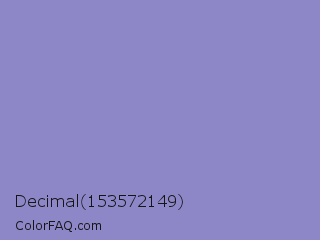 Decimal 153572149 Color is a light indigo color and the nearest color is Ube #8878c3. Hex code #8d87c7 and RGB value is rgb(141,135,199). In RGB color space, this color is composed of 55% red, 53% green, 78% blue, In CMYK color space, this color is composed of 29% cyan, 32% magenta, 0% yellow , 22% black , In HSL color space, this color has a hue angle of 246° , 36% saturation and 65% lightness.