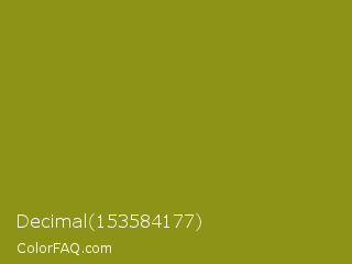 Decimal 153584177 Color is a normal yellow color and the nearest color is Trendy Green #7c881a. Hex code #8d9317 and RGB value is rgb(141,147,23). In RGB color space, this color is composed of 55% red, 58% green, 9% blue, In CMYK color space, this color is composed of 4% cyan, 0% magenta, 84% yellow , 42% black , In HSL color space, this color has a hue angle of 63° , 73% saturation and 33% lightness.