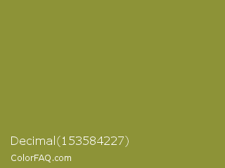 Decimal 153584227 Color is a normal yellow color and the nearest color is Sycamore #908d39. Hex code #8d9337 and RGB value is rgb(141,147,55). In RGB color space, this color is composed of 55% red, 58% green, 22% blue, In CMYK color space, this color is composed of 4% cyan, 0% magenta, 63% yellow , 42% black , In HSL color space, this color has a hue angle of 64° , 46% saturation and 40% lightness.