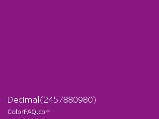 Decimal 2457880980 Color is a normal magenta color and the nearest color is Mardi Gras #880085. Hex code #881782 and RGB value is rgb(136,23,130). In RGB color space, this color is composed of 53% red, 9% green, 51% blue, In CMYK color space, this color is composed of 0% cyan, 83% magenta, 4% yellow , 47% black , In HSL color space, this color has a hue angle of 303° , 71% saturation and 31% lightness.